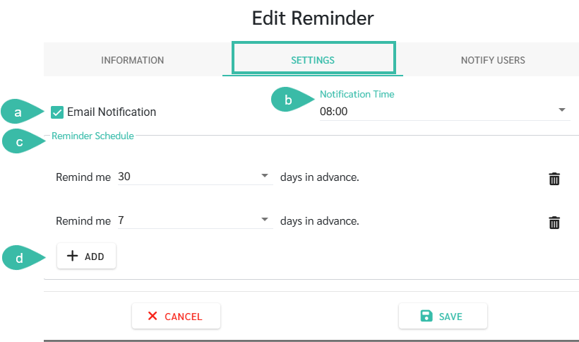 To receive multiple reminders, press the "Add" button. You can receive a maximum of three reminders. For example, you can send the first reminder 30 days in advance, then another reminder 7 days in advance, and finally another reminder 1 day in advance.