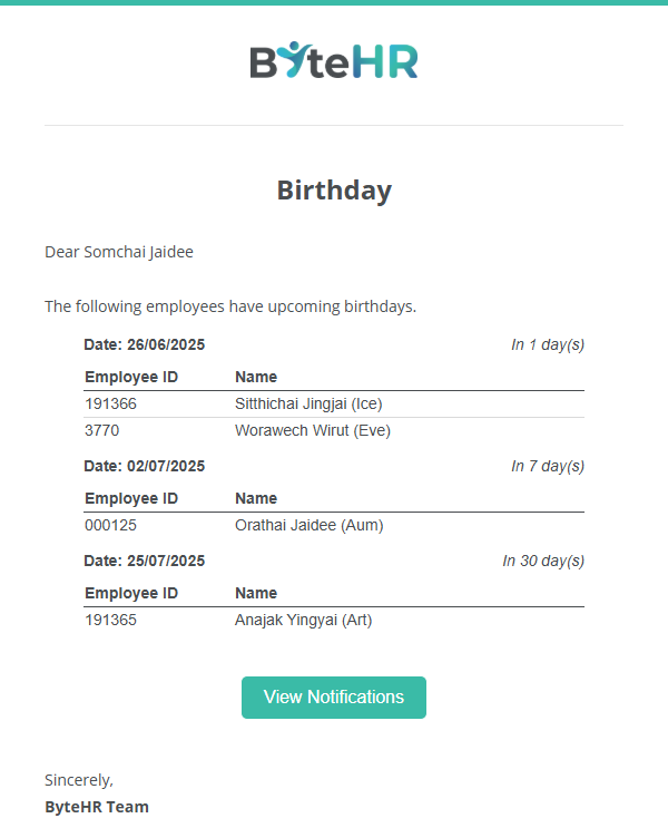 Example of an employee birthday notification via email:
