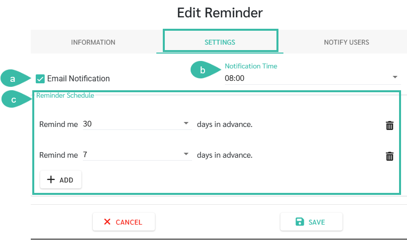 To set up multiple reminders, click the + Add button. You can send up to 3 notifications. For example, the first notification can be sent 30 days in advance, followed by another 7 days in advance, and then a final notification 1 day in advance.