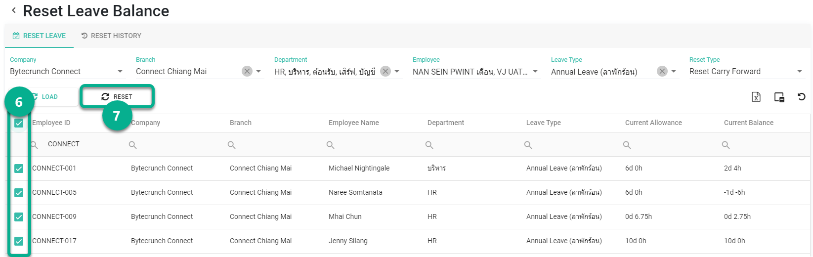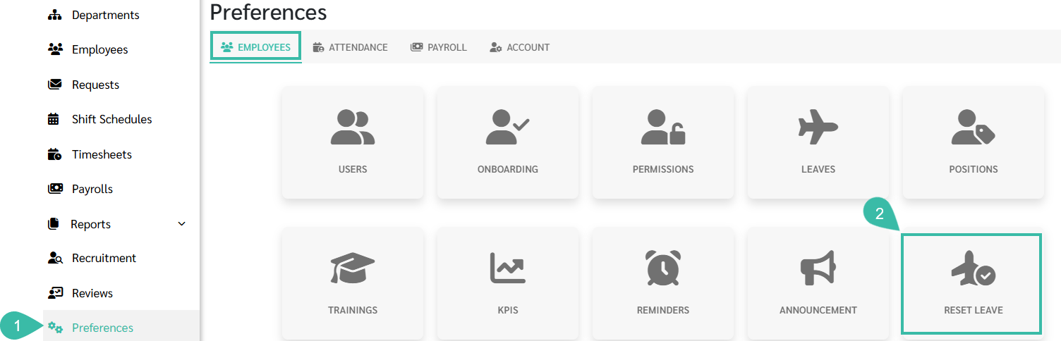 Select Employees. and Click Reset Leave.