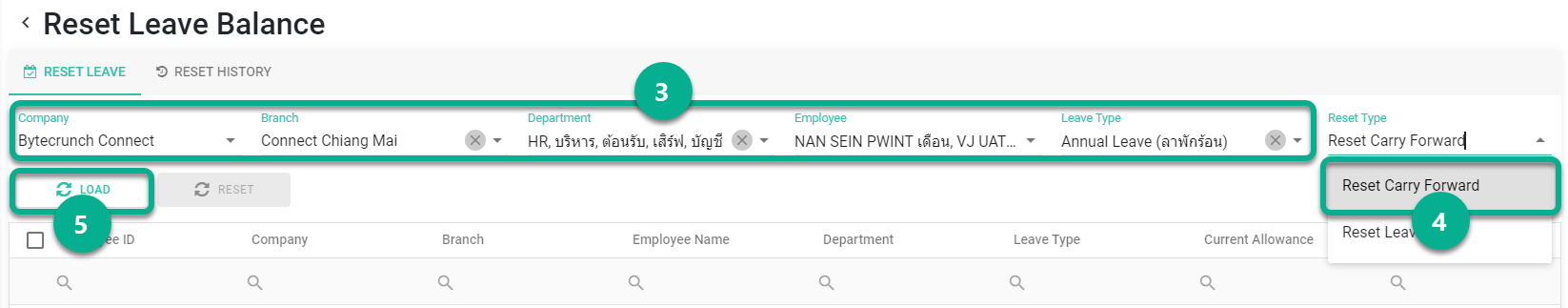 If the system is not configured to automatically reset carry forward leave, the admin can manually reset leave and carry forward leave under the "Reset Leave" section as follows: