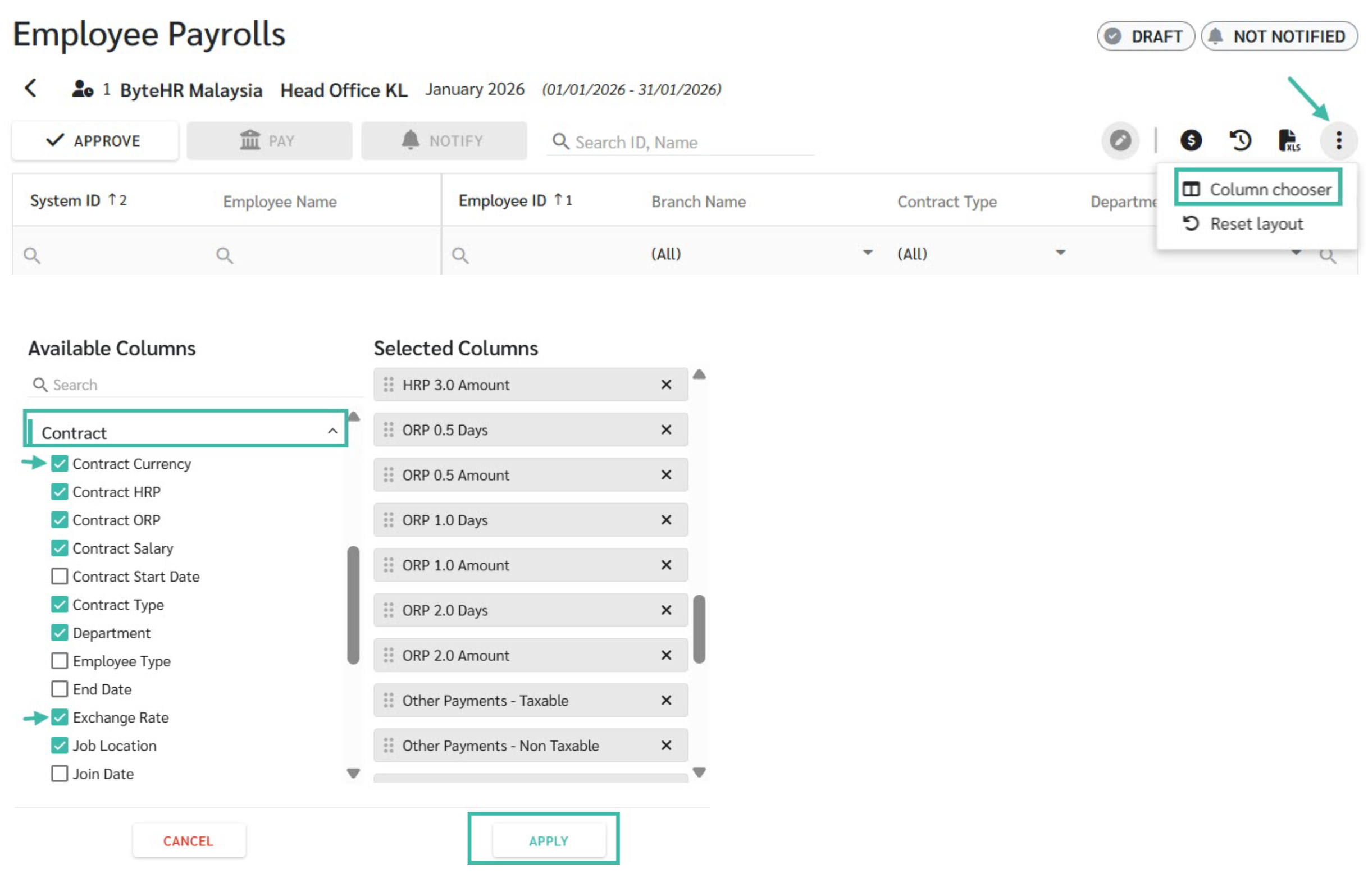 Enable the Exchange Rate Column in Employee Payroll Information via Column Chooser.