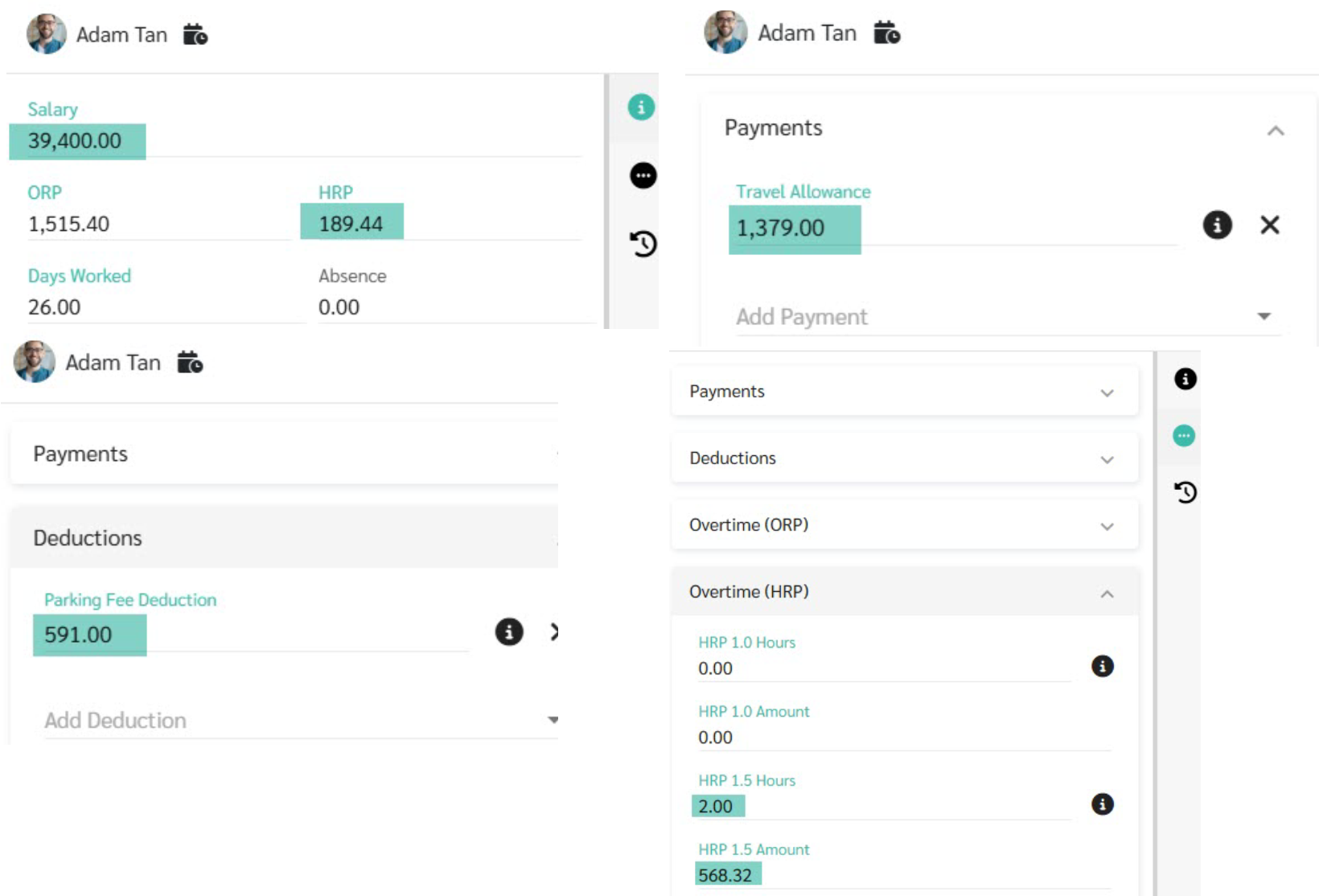 When calculating payroll, if the employment contract selects a foreign currency, the details will be different. The system will convert fixed payments, fixed deductions, and overtime rates to MYR using the specified exchange rate.