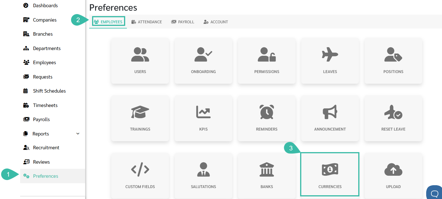 - If the exchange rate changes in a future payroll month, update it under Preferences -> Employees -> Currencies before generating the Payroll.