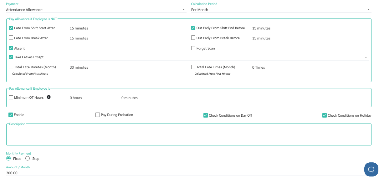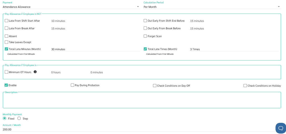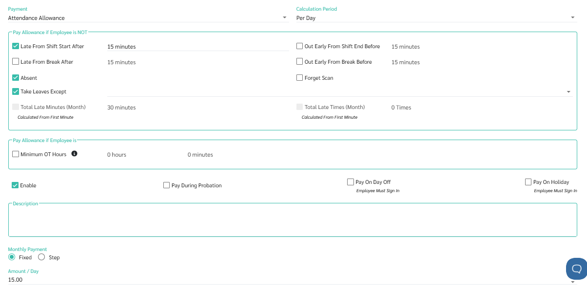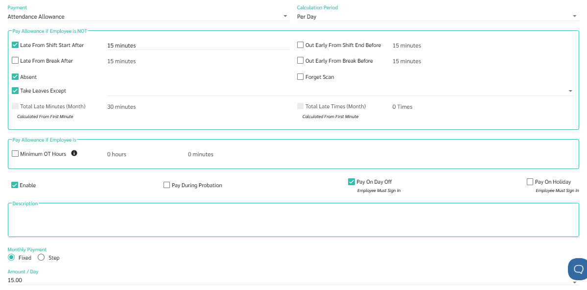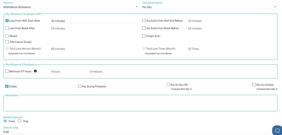 If set to "Per Day," the system will check the data daily. If a day does not violate the specified exceptions, the Allowance payment will be received on that day.