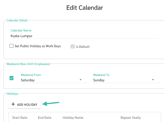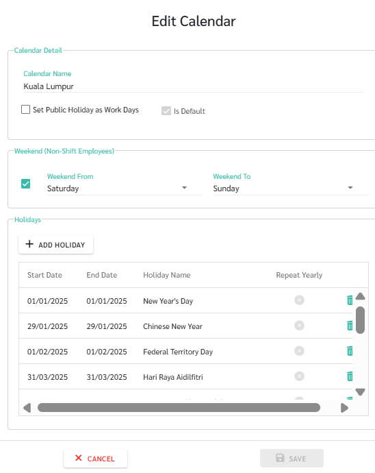 Click Save. The system will save the Added Public Holiday in the Calendar table.