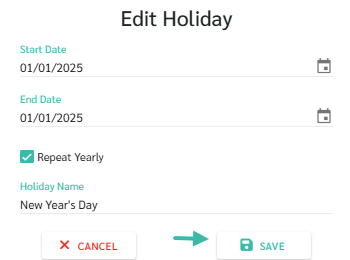 If the public holiday occurs on the same date every year, such as New Year's Day which falls on January 1st, you can tick the Repeat Yearly checkbox. The system will treat the specified date as a public holiday every year.