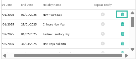 If you added a holiday incorrectly and want to delete it, click the trash icon to delete the incorrectly added holiday.