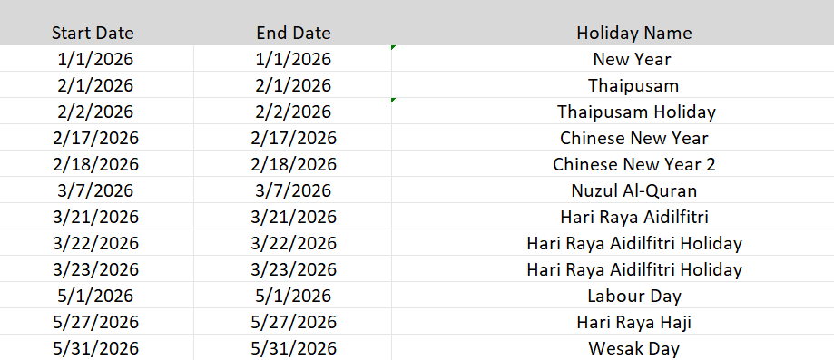 1. If there are repeated yearly public holidays, you cannot upload new holidays with the same day and month.
