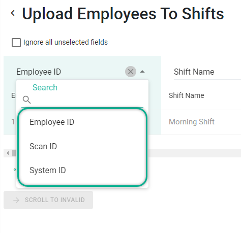 The Employee ID field can be filled with Employee ID, Scan ID, or System ID. Select the column that matches the information in the template.